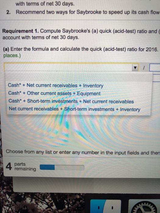 Solved: B. Quick (acid-test) Ratio Select The Formula And ... from media.cheggcdn.com Quick ratio, also known as the acid test ratio measure the ability of the company to repay the short term debts with the help of the most liquid assets and it is calculated by adding total cash and equivalents, accounts receivable and the marketable investments of the company and then dividing it. The quick ratio is a ratio calculated to handle the defects that are present in current ratio. This video demonstrates how to calculate and interpret the quick ratio (aka acid test ratio). It is defined as the ratio between quickly available or liquid assets and current liabilities. Finance specialists often use ratios and calculations to determine the financial health of a business. The quick ratio, also known as acid test ratio, measures whether a company's current assets are sufficient to cover its current liabilities. It is calculated by dividing current assets less inventory by current liabilities. The quick ratio measures the liquidity of a business and its ability to meet its short term liabilities and debts.